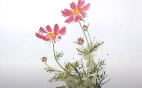 今日も暑かったですね・・・・・ 絵を描く気にもなれないのではと思いつつ、つづけます。 課題のコスモス、さあ参りましょう。 花芯の色:キ、コイキ まずキ筆に含ませてコイキをとります。 筆を横向きにして筆の穂先を置きます。楕...