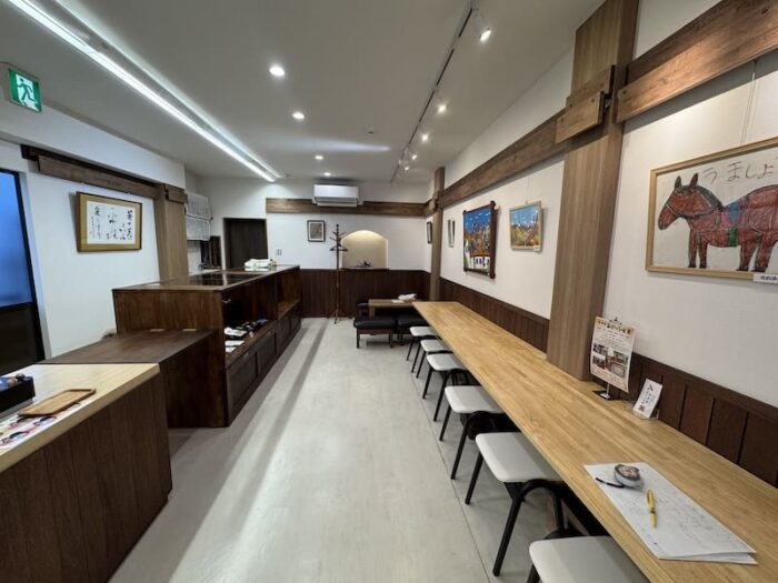 右側にテーブルと椅子があり、ぐるりと絵を飾るスペースがあります。