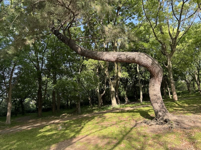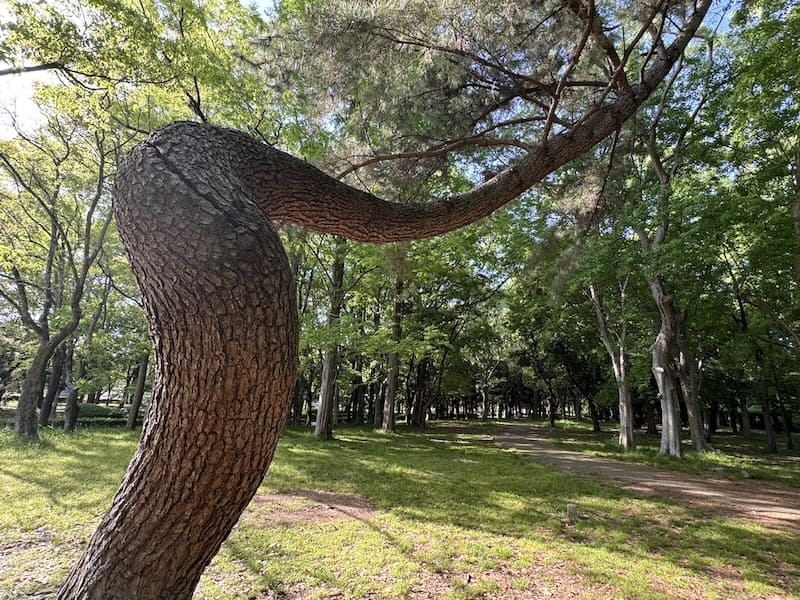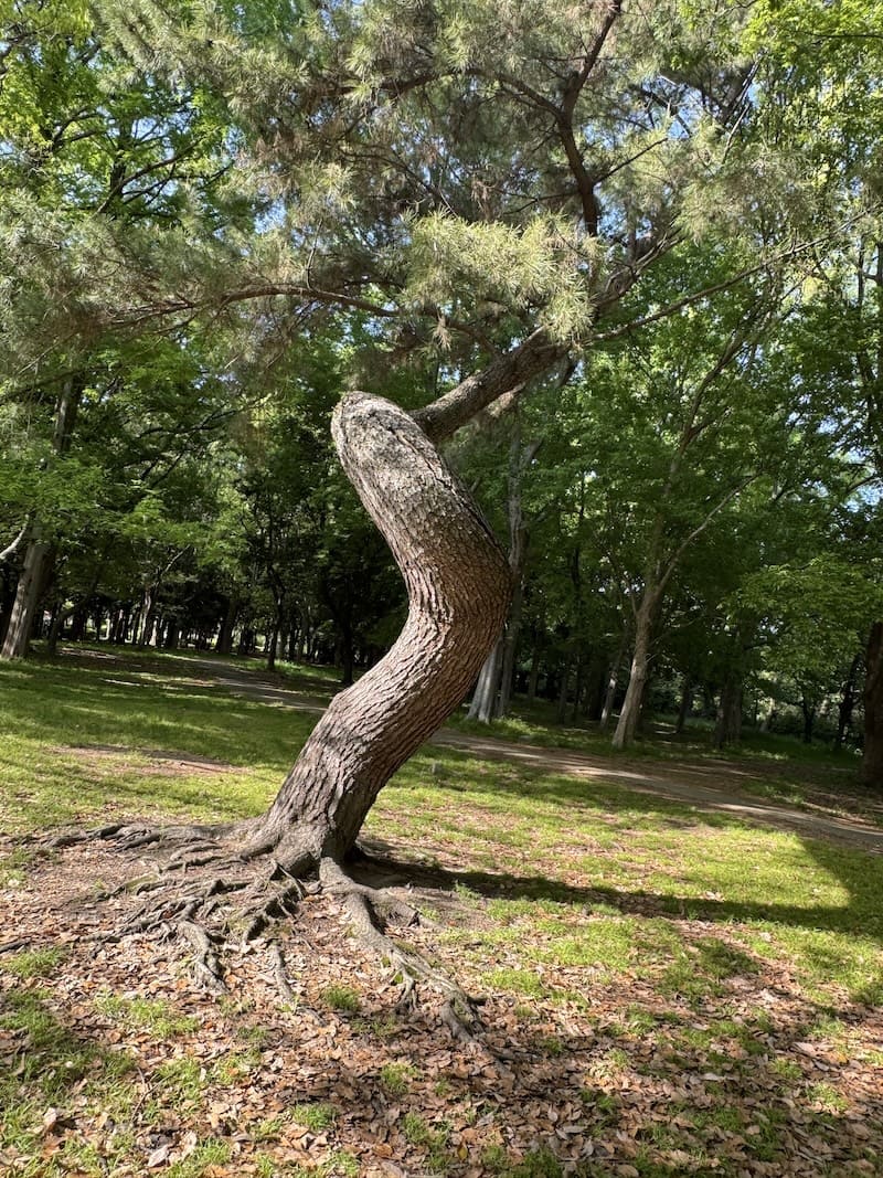 公園内には背の高い木がたくさんありますが、こんなにグイーンと曲がっているのは珍しいです。