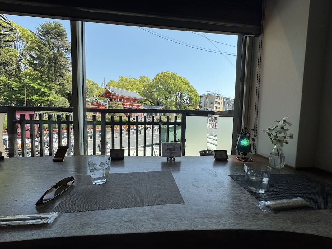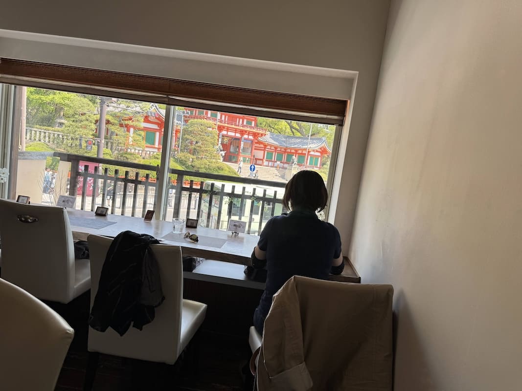 お腹が空いたのでランチタイム、歌舞練場周辺のメインストリートはお店が高級だったり並んでいたり、で、八坂神社の方まで歩いて、パフェで有名なお店へ。