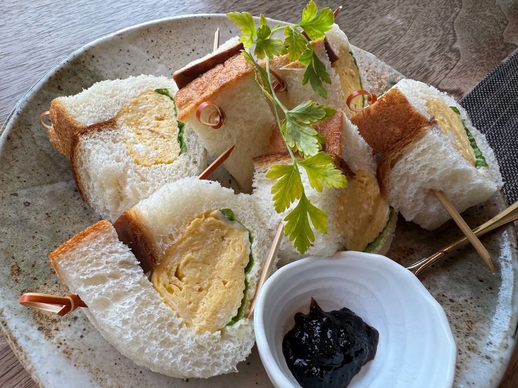 パフェと別に、やはり少しオカズ系を欲していた我々は、軽食の「だし巻き卵サンド」を2人で1つ注文。