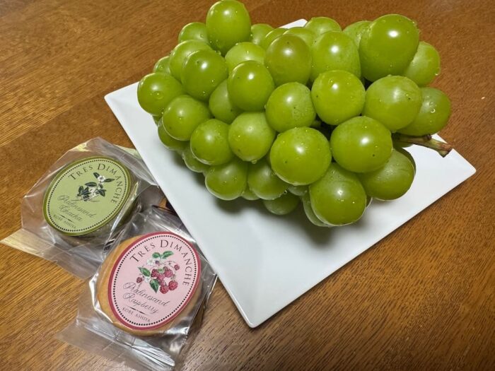シャインマスカットとバターたっぷりのサブレ、ズッシリ重いプラリネサンド。