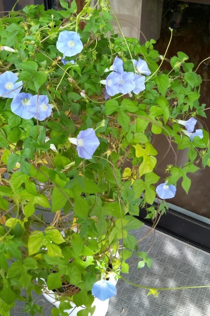 今朝も青いアサガオはたくさん咲いている。